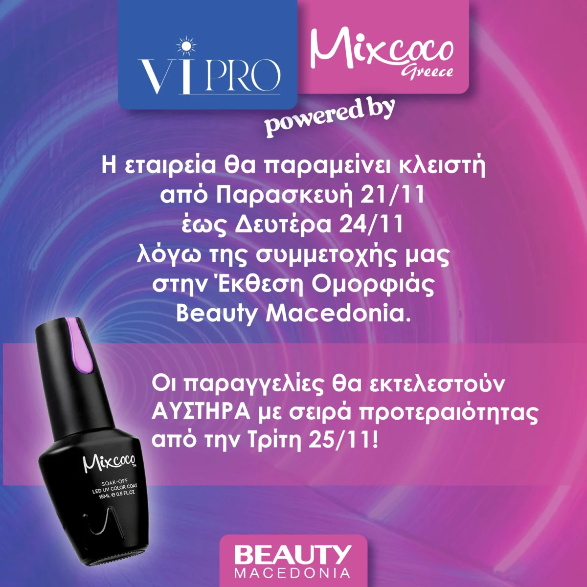 MIXCOCO GREECE Η Mixcoco Greece με την σειρά της έχει συνεχή παρουσία σε όλες τις εκθέσεις ομορφιάς που πραγματοποιούνται στον Ελλαδικό χώρο. Πρωτοπορεί πάντα τόσο σε ιδέες, όσο και σε καινοτόμα προϊόντα της εταιρείας. Η Mixcoco Greece είναι σε θέση να παρουσιάζει μηνιαίως τουλάχιστον 10 νέα προϊόντα στο ευρύ κοινό της (Ημιμόνιμα βερνίκια και μηχανήματα), ώστε οι πελάτες της να βρίσκονται πάντα στην πρώτη γραμμή των εξελίξεων και των καινοτομιών του κλάδου της ονυχοπλαστικής.